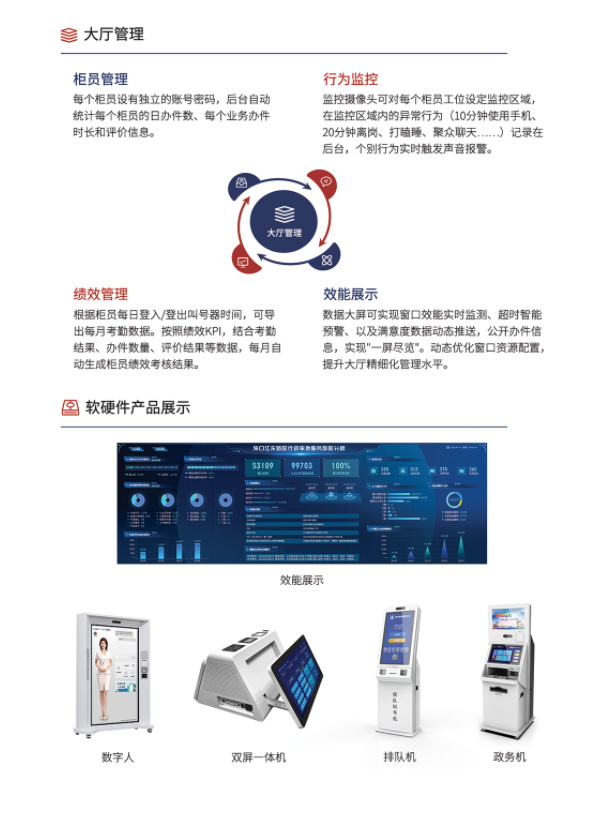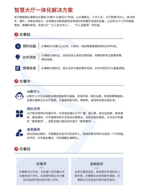 智慧大廳一體化解決方案:根據(jù)辦事群眾辦事前·辦事中·辦事后3個(gè)階段,以辦事群眾、工作人員、大廳管理為中心,結(jié)合軟件、硬件、AI等各項(xiàng)技術(shù),全場(chǎng)景全流程地提供各種相應(yīng)的軟硬件系統(tǒng)和設(shè)備,以達(dá)到大廳工作的智能、高效、便捷和親民,實(shí)現(xiàn)大廳“以人民為中心”“為人民服務(wù)”的宗旨