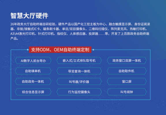 我司作為深耕智能終端設(shè)備與智慧政務(wù)解決方案領(lǐng)域的企業(yè),此次展會(huì)將攜智慧政務(wù)服務(wù)大廳一體化解決方案,軟硬件專業(yè)設(shè)計(jì)與制造,AI數(shù)字人導(dǎo)辦排隊(duì)一體機(jī)、排隊(duì)機(jī)、雙屏政務(wù)窗口一體機(jī)核心產(chǎn)品亮相。