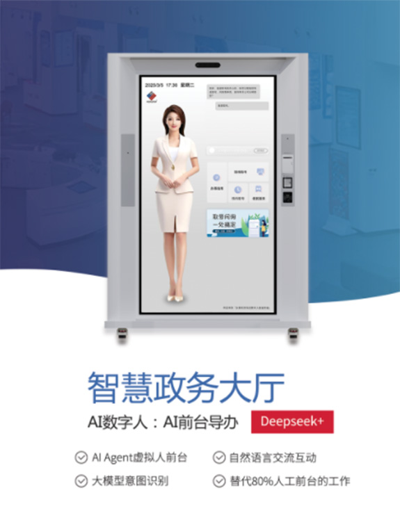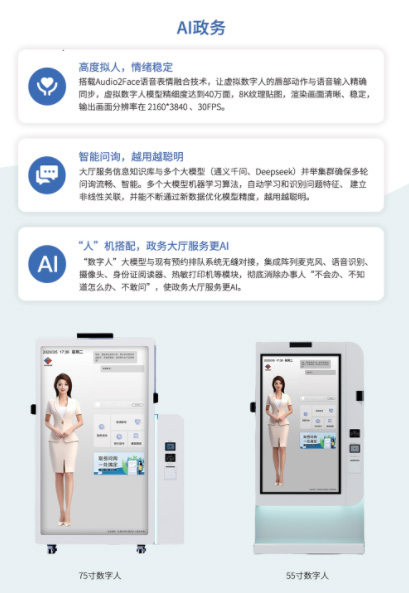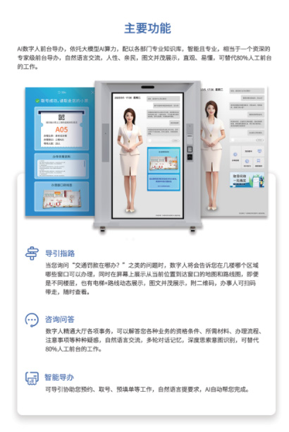 AI數(shù)字人導(dǎo)辦機(jī):依托大模型AI算力,配以各部門(mén)專業(yè)知識(shí)庫(kù),智能且專業(yè),相當(dāng)于一個(gè)資深的專家級(jí)前臺(tái)導(dǎo)辦,自然語(yǔ)言交流,人性、親民,圖文并茂展示,直觀,可替代80%人工前臺(tái)的工作。提供7×24小時(shí)在線咨詢、業(yè)務(wù)引導(dǎo)、材料預(yù)審服務(wù);同時(shí),集成語(yǔ)音交互咨詢、多業(yè)務(wù)智能分流排隊(duì)、實(shí)時(shí)信息展示、數(shù)據(jù)統(tǒng)計(jì)分析等功能,以 AI 技術(shù)實(shí)現(xiàn)全流程智能服務(wù),有效解決群眾辦事咨詢難、流程復(fù)雜等痛點(diǎn),大幅提升政務(wù)辦理效率與群眾體驗(yàn)。
